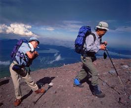 JAPAN. Mount Fuji. A group of older climbers check the route...