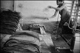 THAILAND. Pattani Province. A man piles up mats of raw rubber...