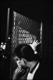 USA. Brooklyn, NY. 1957. Couple necking on pole at basement party...