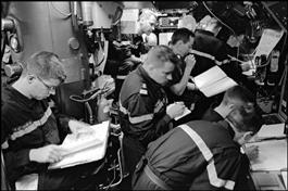 Piloting the submarine, a group of 5 crew who mutually watch...