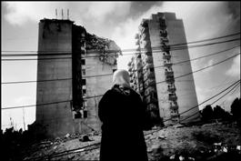LEBANON. Tyre. July, 2006. A woman walks by two buildings destroyed...