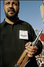 IRAQ. Karbala. A Shi'ite militia, armed with a Kalashnikov, watches...