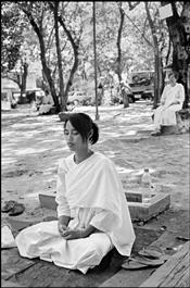 THAILAND. Ayuthaya. Wat MAHEYONG. Women dressed in white meditate...