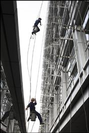 CHINA. Beijing. Migrant worker "Mingong" cleaning windows. 2006....