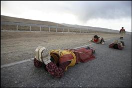 CHINA. TIBET. Buddhist pilgrims on a road, next to part of the...