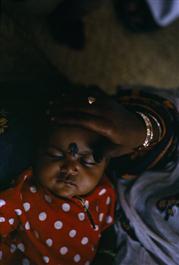 UNITED ARAB EMIRATES. Dubai. Child sleeps while mother helps...