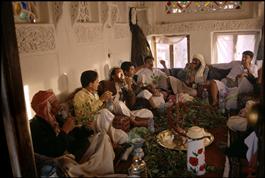 YEMEN. Sanaa. Men chewing "khat" (soft herbal drug), in the "mafraj"...