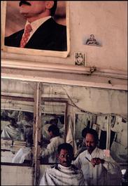 YEMEN. Sanaa. Barber shop with a portrait of President Ali Abdullah...