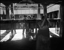 CHINA. 1998. Tibet. Lhasa. Buddhist monk praying inside the Jokhang...