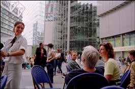 GERMANY. Berlin. Shoppers take a break in the Potsdamer Platz...