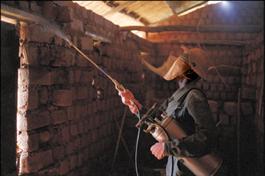 Africa. Burundi. Kigarama. An MSF technician sprays a building...