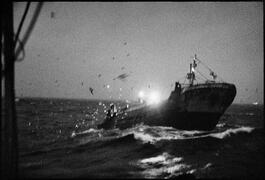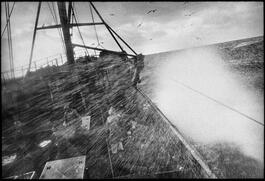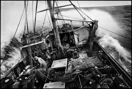 Originally from the French southwest coast, Jean Gaumy has often returned to his maritime roots. From 1984 to 1998, he followed traditional Spanish fishing boats that are the last of their kind in Europe. "Hurled when the boat dives, the steep and greasy stairs we climb become a pestle as we go over a wave. The iron airlock. The sticky air of diesel vapors. The large linoleum imitation floor, blistered, brown and greasy. Everything flutters about. The portholes' light is dancing on the walls and behind the thick glass, the sea runs off distorting the vision. The unpredictable gray sky devastated...