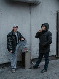 KAZAKHSTAN. Almaty. January 2022. Men smoke cigarettes near a...