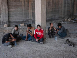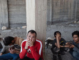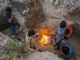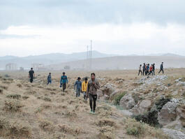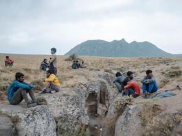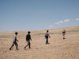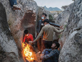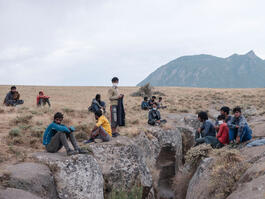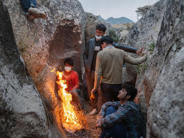 Turkey, Van. 2021. August 6. Migrants hide near rocks after fleeing...