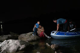USA. ROMA, TX. Migrants arrive on shore after crossing a narrow...