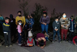 USA. ROMA, TX. Migrants kneel and pray after crossing a short...