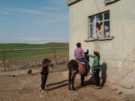 TURKEY. Siirt. 2020. A child talks to his mother on his donkey...
