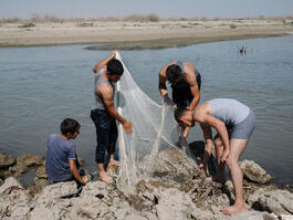 TURKEY. Hasankeyf. 2020. Teenagers collect fishing nets on a...