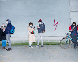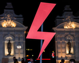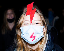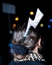Protester with red bolt a...