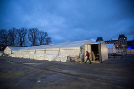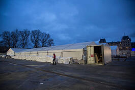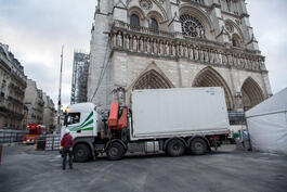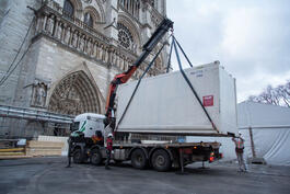 FRANCE. Paris. 04 December 2020. Notre-Dame cathedral. Removal of the container carrying the last elements of the organ.