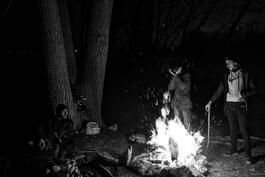 Turkey, Edirne. 2020. Syrian refugees warm near a fire on Turkish...