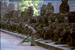 Cambodia. Angkor. Angkor Thom temple. A road sweeper works...