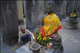 Cambodia. Angkor. A nun tends a Buddhist shrine in the temple...