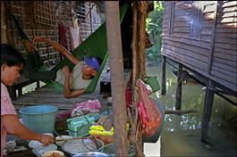 Cambodia. Siem Reap. Hammocks are slung between the houses...