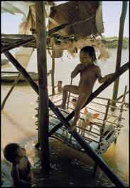 Cambodia. Chong Khnies. Tonle Sap Lake. A small boy stands...