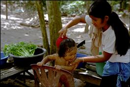 Cambodia. Siem Reap. A mother bathes her small protesting...