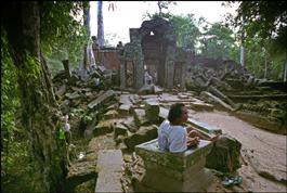Cambodia. Angkor. A man rests on a piece of fallen statuary...