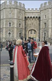 England. Windsor. Young tourists puzzled by girls in medieval...