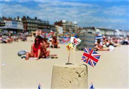 GB. England. Weymouth. A girls plays on the beach with Great...