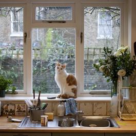 GB. England. London. Cat on a windowsill in a kitchen in Finsbury...