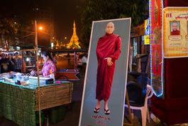 MYANMAR. 2014. YANGON. Preparing or a Buddhist monk to lecture...