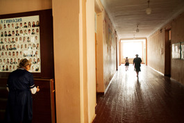 UKRAINE. Petrokhiv. 2006. A young orphan waits in her classroom...