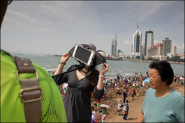 China. Shandong Province. Qingdao. Families on the beach enjoy...