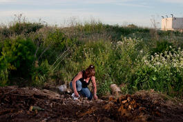 USA. Vallejo, CA. 2016. Tina digging for opalescent bottles in...