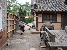 DPR Korea. Sinuiju. 2015. A woman in traditional dress prepares...