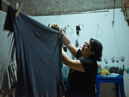 BRAZIL. Sao Paulo. 2019. Andrea Ramos finishes the laundry while...