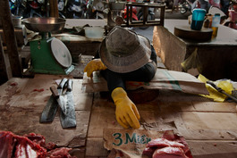 VIETNAM. Lavazza, 2013. Butcher resting on a table next to his...