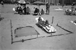 USA. NYC. Coney Island. 1977. Man sunbathes on beach surrounded...