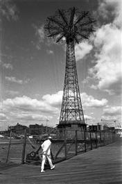 USA. NYC. Coney Island. 1977. Man walking by parachute jump ride...