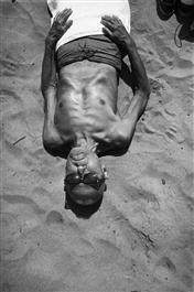 USA. NYC. Coney Island. 1977. Man exercising on the beach.