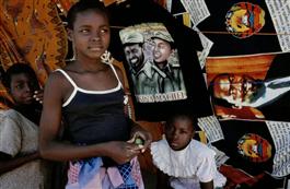 MOZAMBIQUE. Moma. 2002. Repairing net with sleeping child.