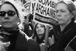 USA. NYC. 10/27/01. People carry signs during an emotional protest....