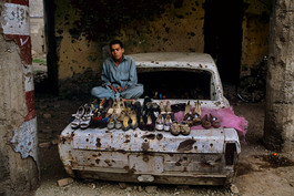 AFGHANISTAN. Kabul. 2003. Boy sells shoes on a rusted car.
