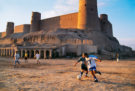 AFGHANISTAN. Herat. 2003. Men play soccer outside at Bala Hisar...