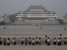 NORTH KOREA. Pyongyang. 2011. A North Korean soldier stops tourists...