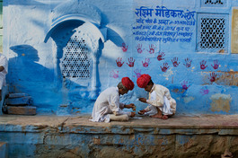 INDIA. Jodhpur, Rajasthan, 2007. Men play cards in front of a...